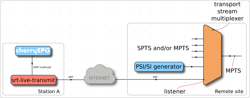 SRT is particularly useful when transporting EIT streams securely over public or unmanaged IP networks — for example when the multiplexer is located at a remote uplink site.